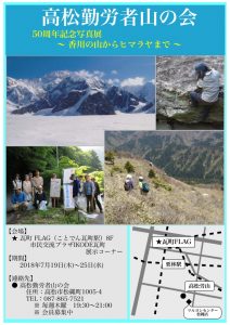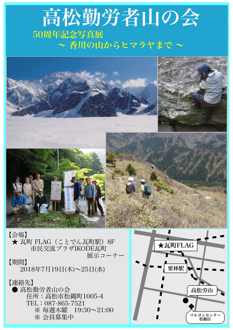 【告知】50周年記念写真展を開催します 山行報告 2018.06.272018.06.28本会の50周年を記念しまして、写真展を開催します。【期間】2018年7月19日(木)~25日(水) 【会場】瓦町FLAG(ことでん瓦町駅) 8F 市民交流プラザIKODE瓦町 展示コーナー(高木)