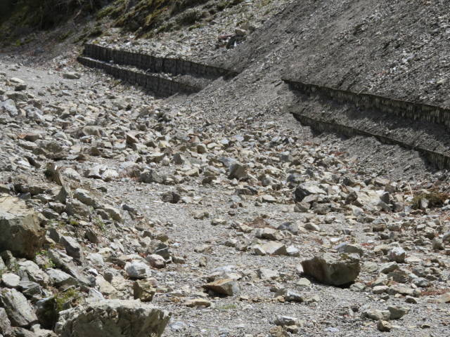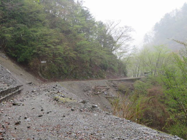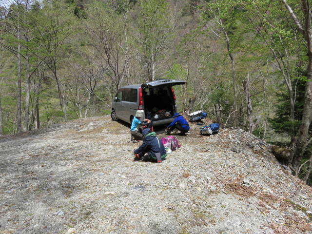 初日、林道を新緑を楽しみながら、3時間かけやってきた・・アレー、道が土砂で埋まってる・・安全なここに止め登山口まで歩きます・・