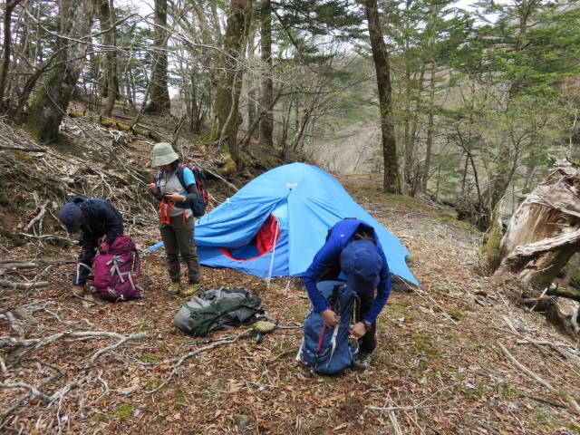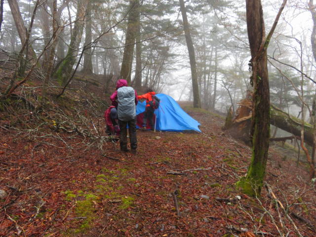 登山口に着き、すぐ横にテント設営・・割と平たんで快適・・