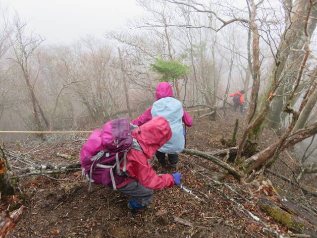 稜線に上がり進むと、急な下りだ・・こんな山奥にロープ張ってる、ありがたい・・