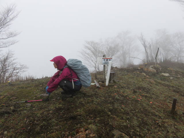 踏み跡のないガスの稜線をたどってゆく、あまり離れないよう進む・・