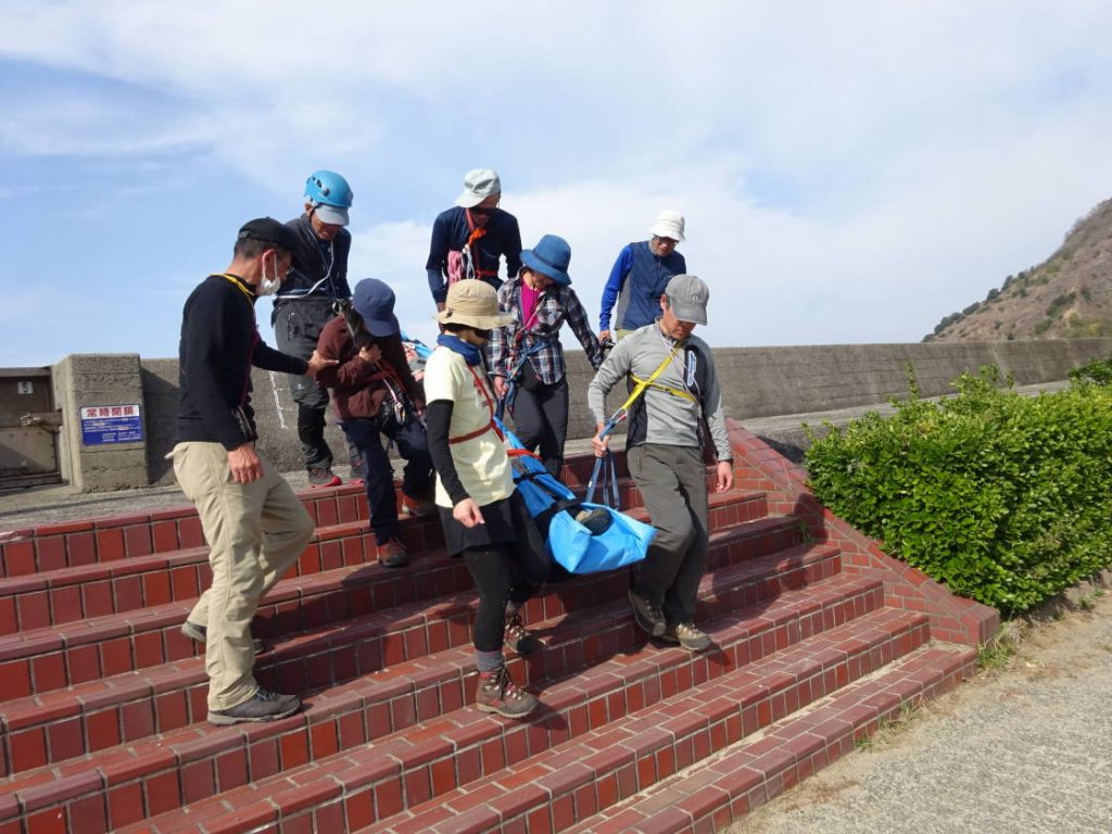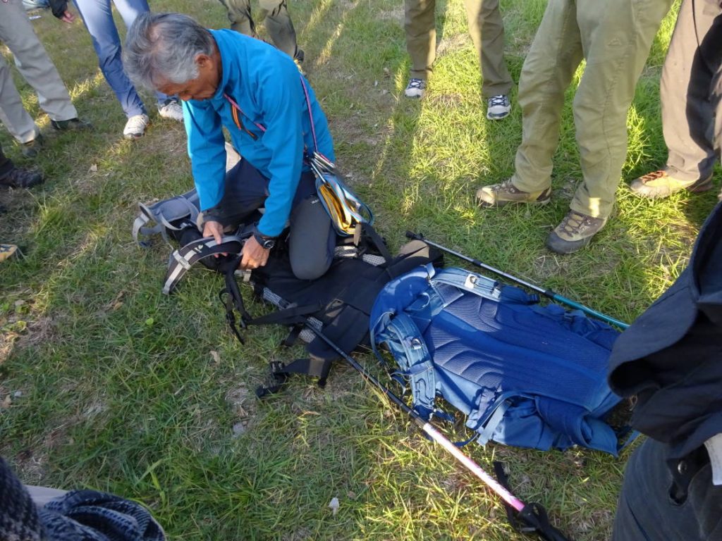 右足骨折のためここまで背負い搬送し、リュック担架でヘリが来るところまで搬送する・・