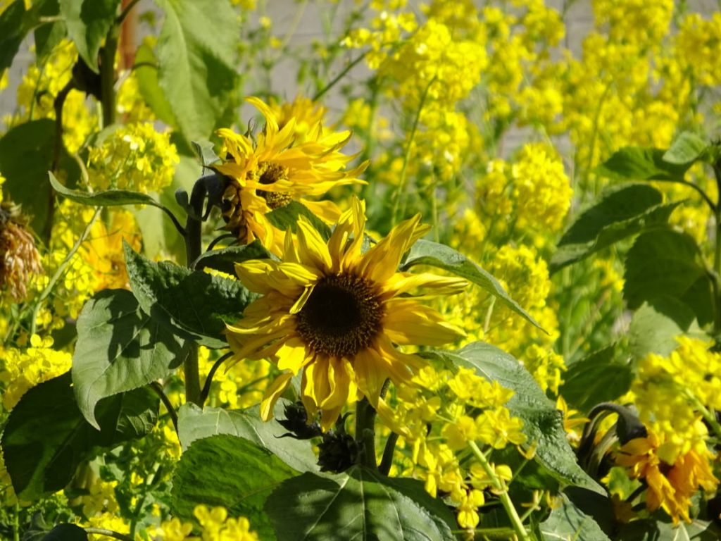 港前の休憩所くすくすの前に、季節外れのひまわりと菜の花のコラボだ・・