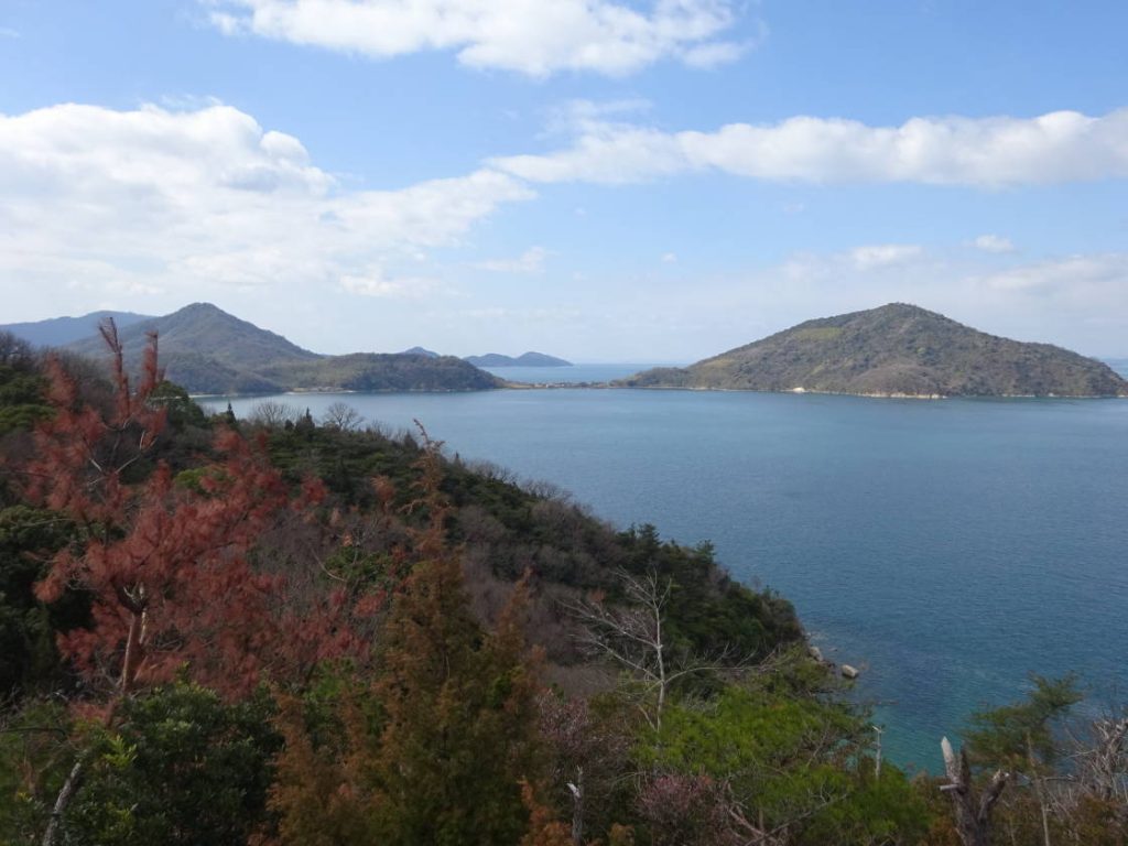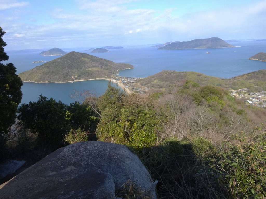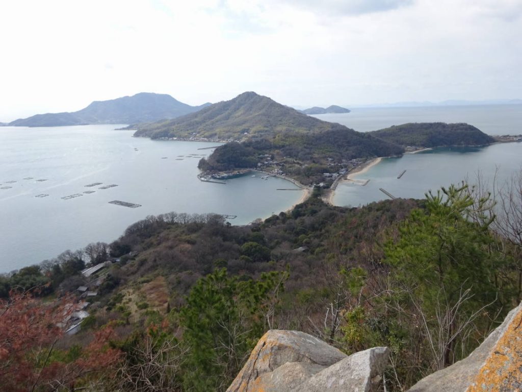 紫谷山(145m)は登れないと思っていたが、海上タクシーの船長が整備して登れるよ、補助ロープも張ってると言ってたので、探しながら歩いていたら登り口らしき道があり、人が居たので聞くと登れるそうだ・・急遽登山・・正面城山で後ろが荘内半島・・