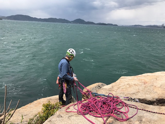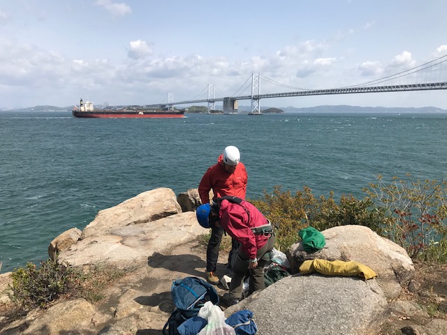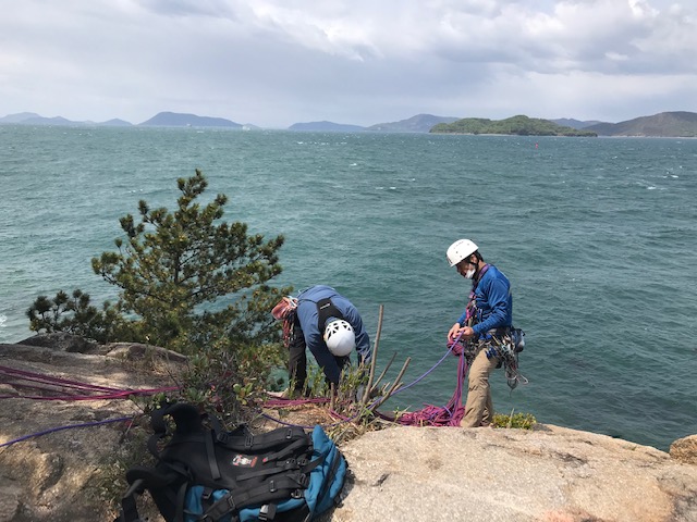 海辺ロック 山行報告 2021.04.252021.08.212021年4月18日(日)雨の次の日、濡れているだろう予定の岩場を変更して、少し濡れてものぼれる花崗岩の岩場に向かった。瀬戸内海の美しい景色の中のロープクライミングである。寒く、風が強くロープがとばされるような、波しぶき散る天候だった。しかし、明るく爽快だった。