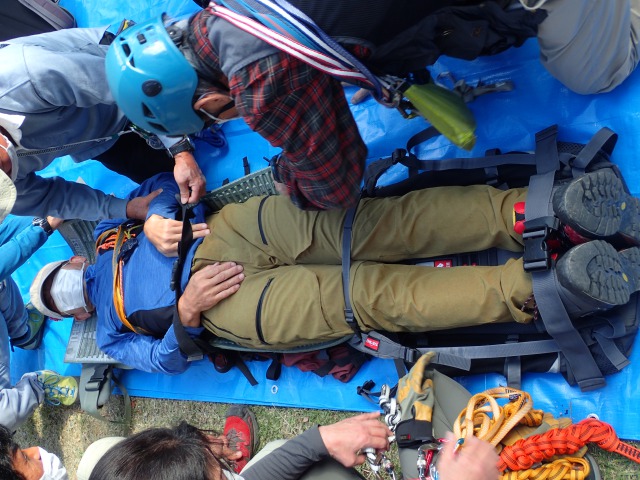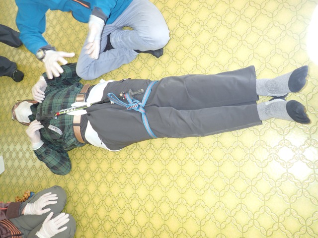 ザックを複数組み合わせてのザック担架搬送の事故者固定を練習