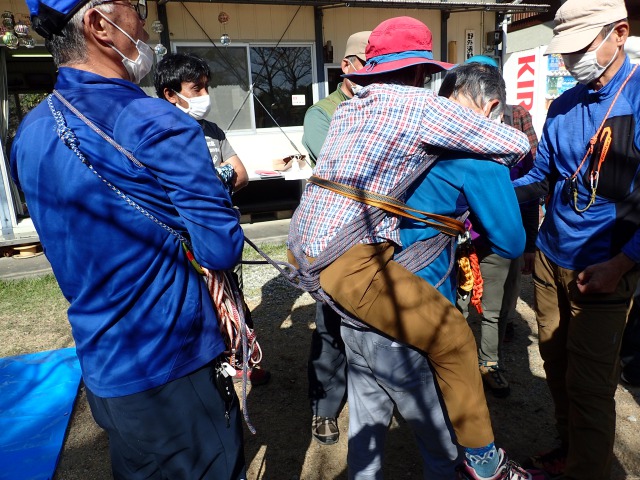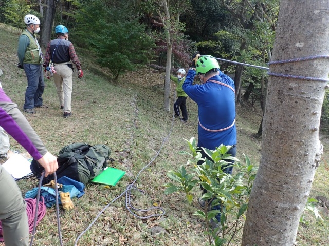 危ないところを安全につうかするためのロープ設置、事故者の搬送法を練習した。これらのことを練習しておくと、いざというときや役立てられると思う。山以外でも必要なことだと思いました。