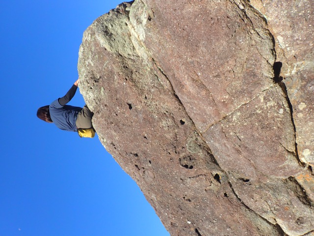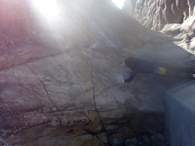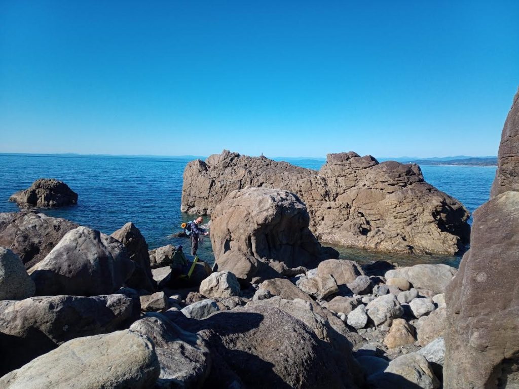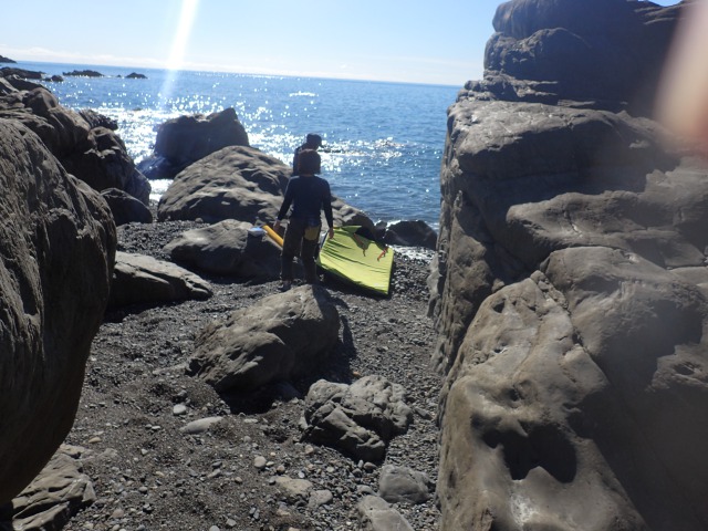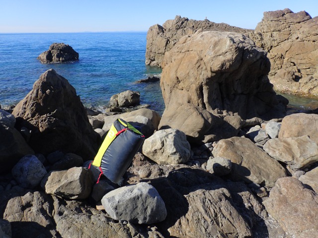 大山岬は黒潮ボルダーのメインとしてしられるところです。ここの課題を目指して、全国からクライマーが来るそうです。トポによると10級から3段くらいまであるので、いろんなレベルの人が楽しめるようです。岩質は砂岩で摩擦がきき、花崗岩より手と靴に優しい。ただ、海岸で下地が悪いので、低い課題でもマットやしっかりしたスポッターが必要だと思います。太平洋と水平線、太陽の反射光を浴びてのボルダリングは気持ちいいです。