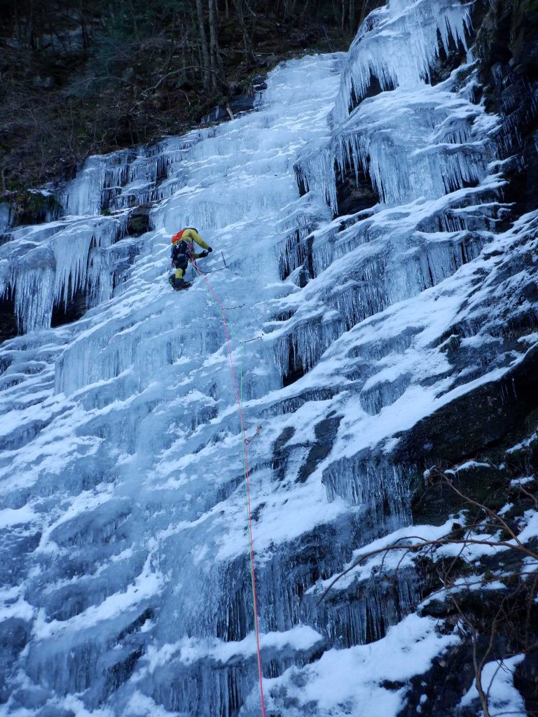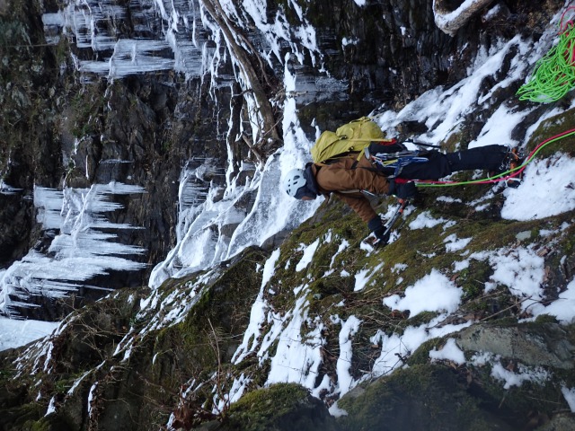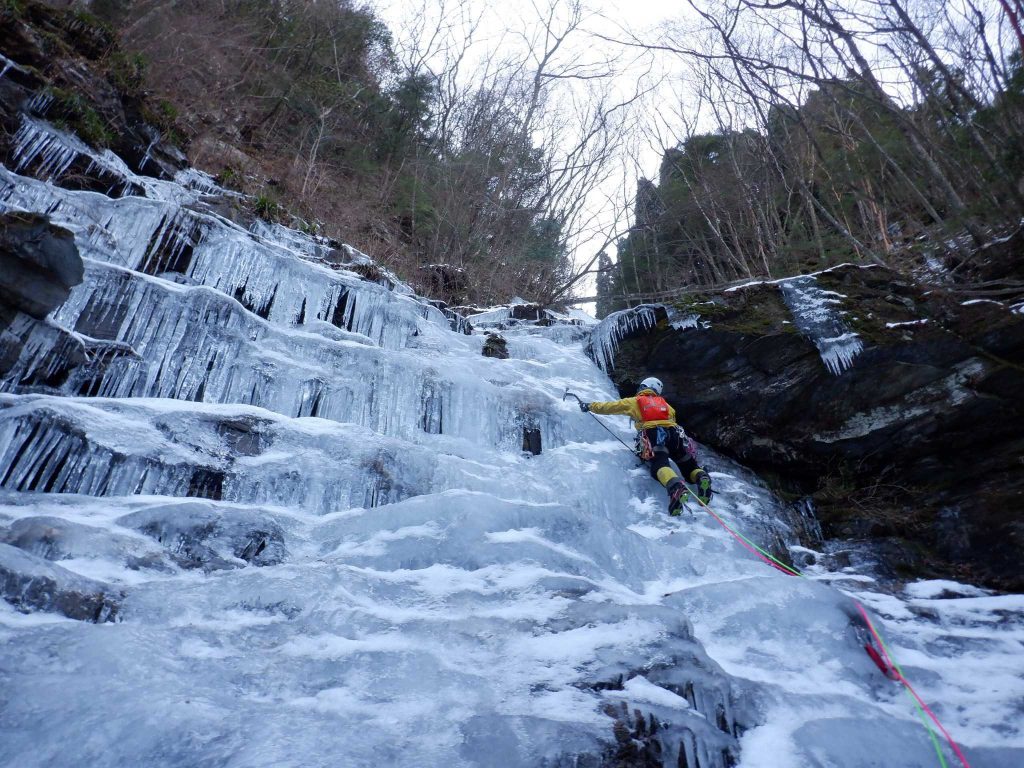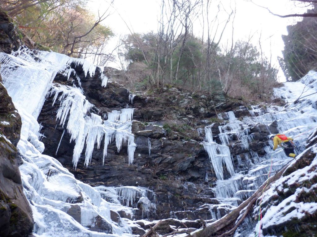 久しぶりのアイスクライミング 山行報告 2022.01.122022年1月10日。ここ何年か温暖化のせいで氷結せず、くわえてコロナ禍でアイスクライミングができなかった。今年は、ラニーニャ現象のせいか寒波がつづくので、大永山トンネルフォールへ行った。氷結は甘いものの久しぶりにアイスクライミングができた。右側のアイスを登った。2段。さらに奥に詰めていく。1段目。氷の厚いいところを選んで登る。2段目。アイススクリューをねじ込む。若者は勇猛果敢に垂直のアイスに挑む。