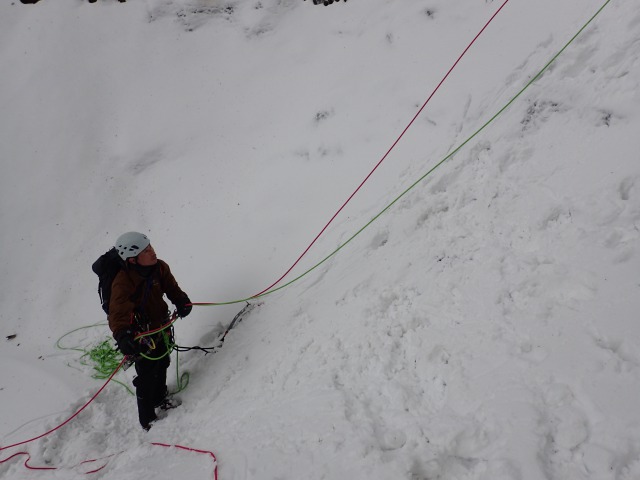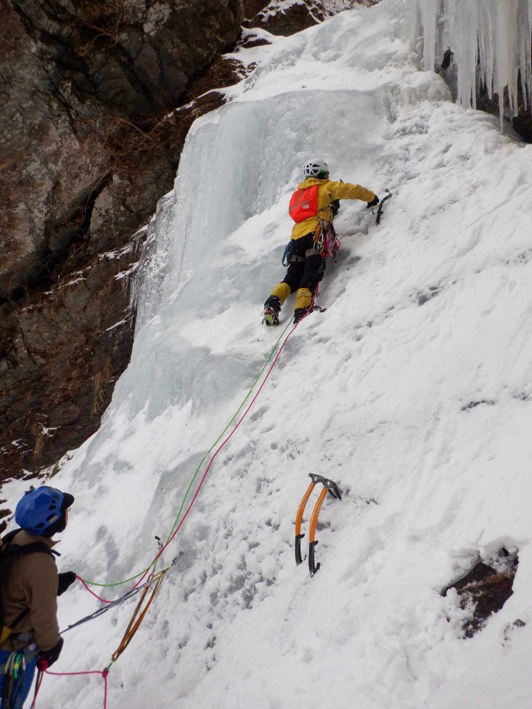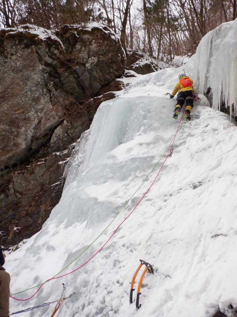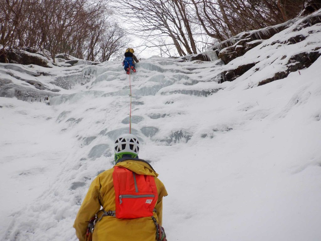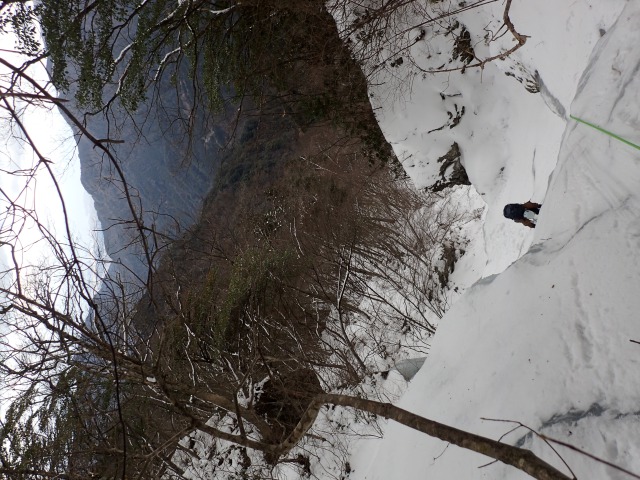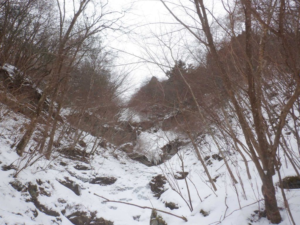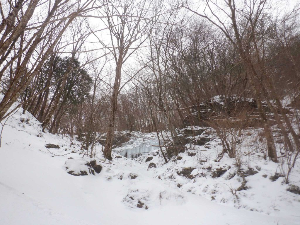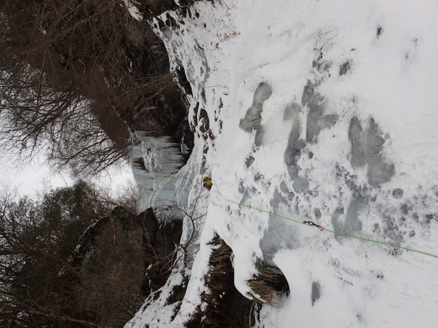 大永山トンネルからちち山・笹ヶ峰の登山道を右に分け作業道跡を行く。道は崩壊して歩きにくい。若手2人はどんどん行く。ロートルはよれよれとゆく。西鈴尾谷についくと、取り付きから凍っていた。3人でリードを交代しながら何段か登った。さらに上部や支流もまだまだ登れるところがあるようだ。時間切れとなり次回の課題として残し、からまったロープに苦戦しながら何回か懸垂して取り付きに降りた。登山口近くの渓谷沿いはすべりやすいので要注意。新居浜の温泉で体を温める。気分はバリ島リゾート。