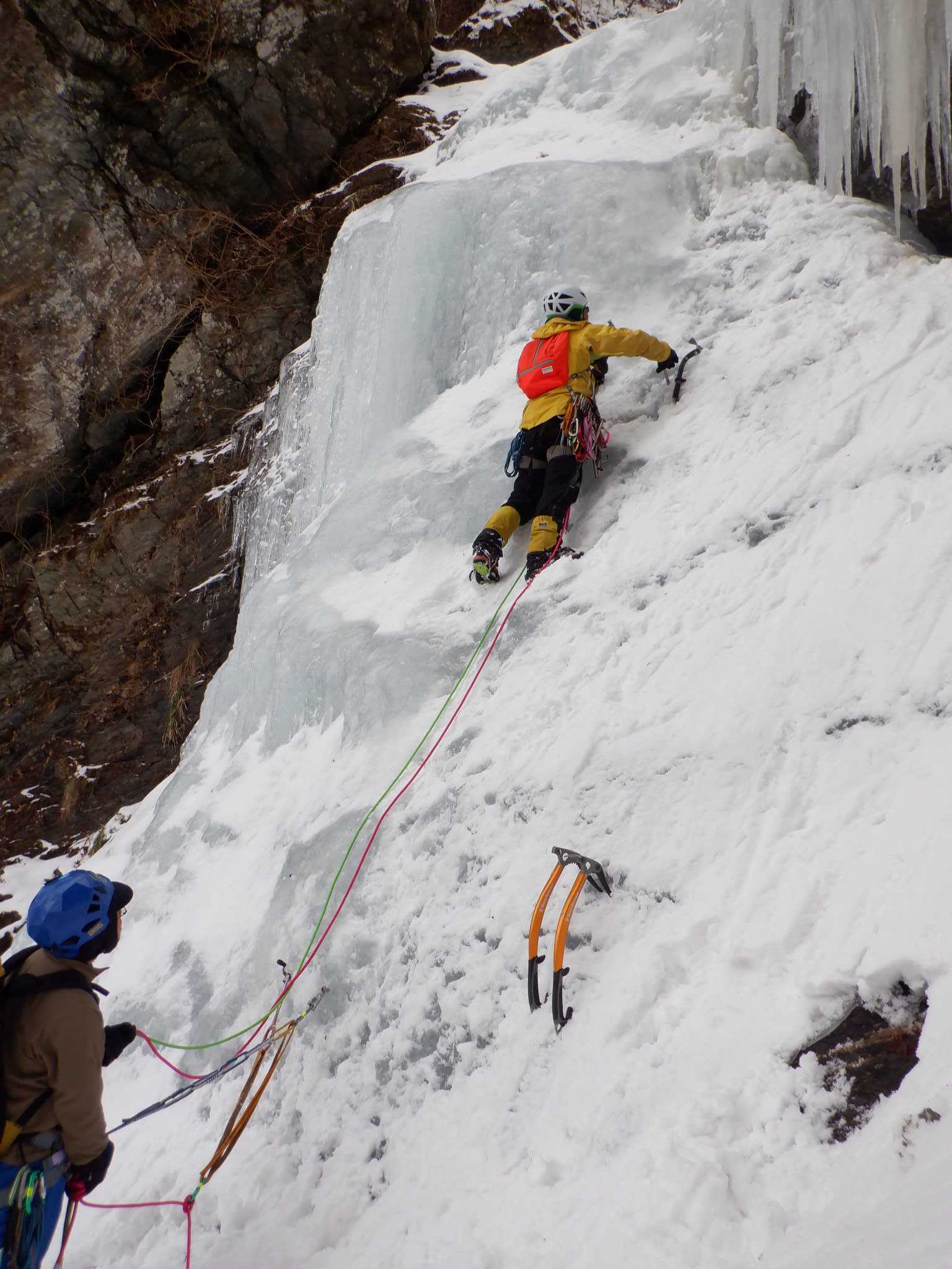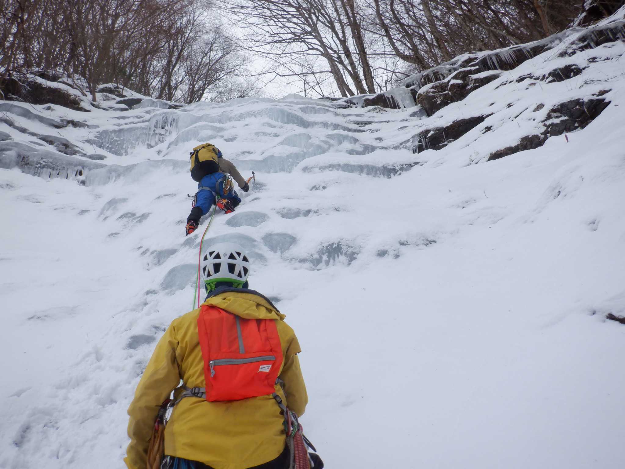 大永山トンネルからちち山・笹ヶ峰の登山道を右に分け作業道跡を行く。道は崩壊して歩きにくい。若手2人はどんどん行く。ロートルはよれよれとゆく。西鈴尾谷についくと、取り付きから凍っていた。3人でリードを交代しながら何段か登った。さらに上部や支流もまだまだ登れるところがあるようだ。時間切れとなり次回の課題として残し、からまったロープに苦戦しながら何回か懸垂して取り付きに降りた。登山口近くの渓谷沿いはすべりやすいので要注意。新居浜の温泉で体を温める。気分はバリ島リゾート。