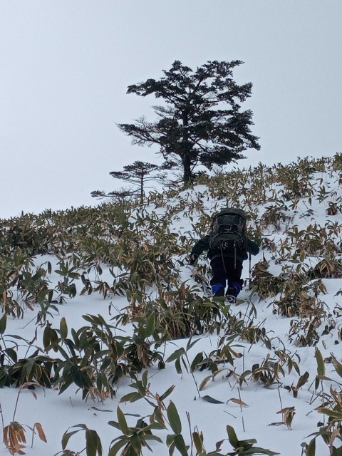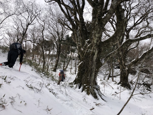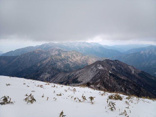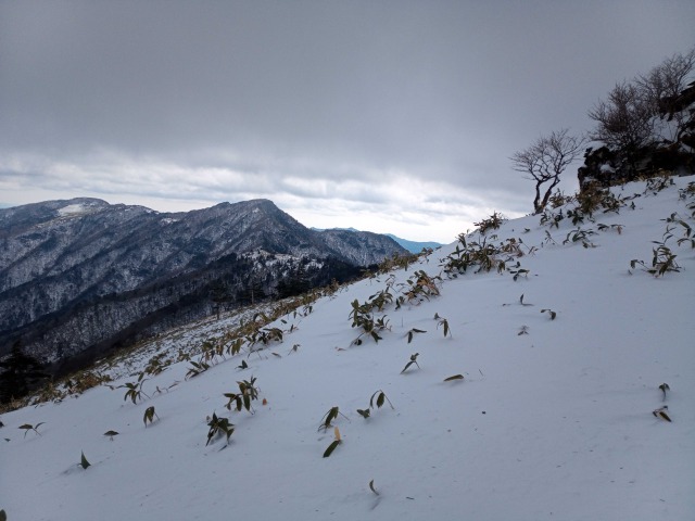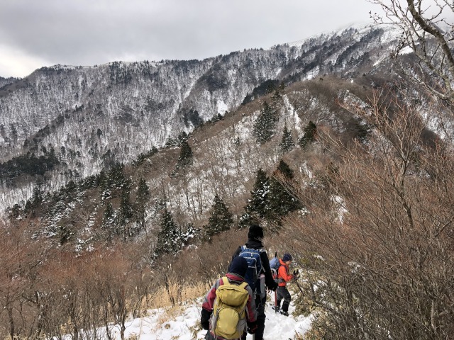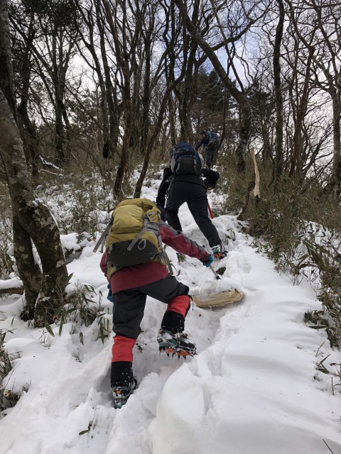 雪のちち山、大永山トンネル口から 山行報告 2022.01.172022.01.182022年1月16日のちち山山行は、12時をリミットに行ける所まで行こうと出発、獅子舞の鼻を越えた辺りからトレースも無くなり笹原になった辺りから雪も深くなり登りもきつくなりここで時間切れとなるがもう少しということで、4人のうち1人だけがちち山の別れまで足をのばす。初めての雪山山行の人もいましたが8時間半のコ-スタイム、アイゼンを付けて頑張りました。登山口近くの渓谷沿いは滑りやすいので要注意。帰りは新居浜の温泉で体を温めました。極楽、極楽。ブナの林を行く平家平方面?アイスフォールが見える。四国山地の雪山はササの沈み込みに耐えて。赤石方面?