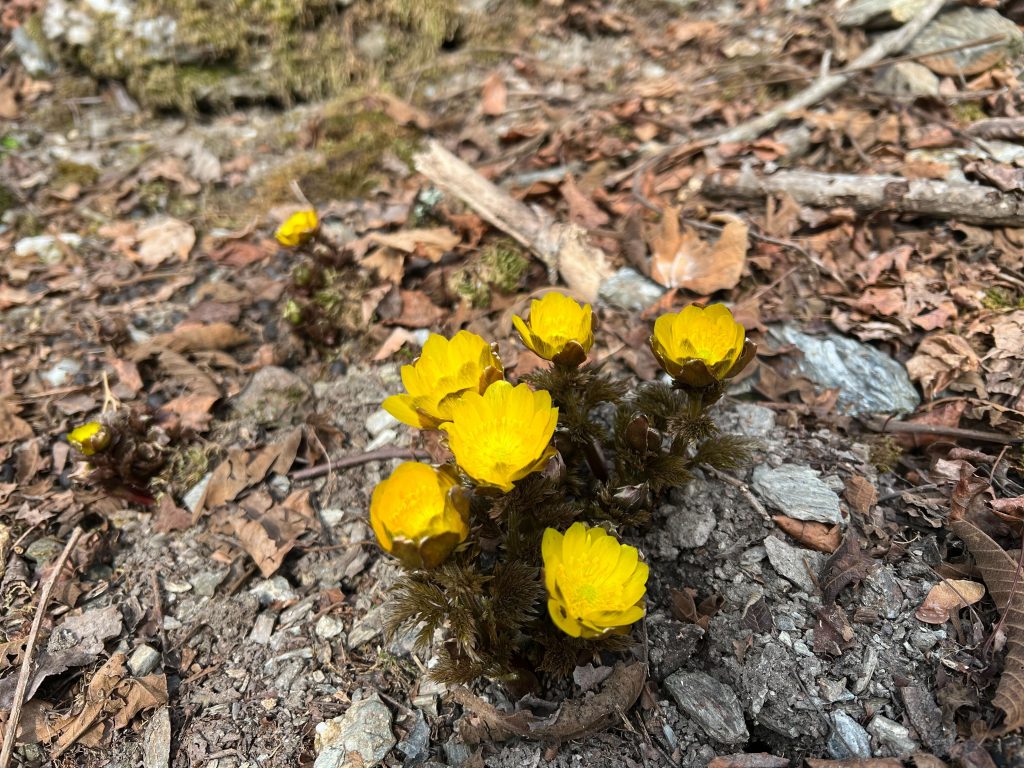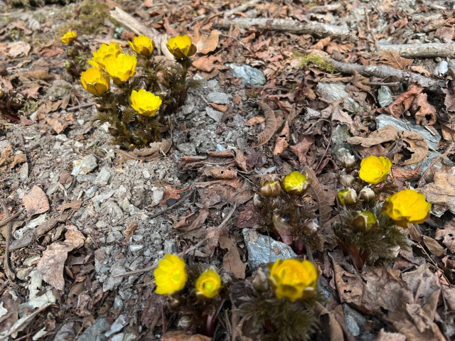 山の春はもうすぐ。寒峰の福寿草 山行報告 2022.03.142022.03.152022年3月13日祖谷の寒峰に6名で行ってきました。今年の寒さを物語るように日陰にはたっぷりと雪が残っていました。そんな中、春を告げる福寿草が可憐な花を咲かしていました!フクジュソウ落葉樹林内に群生するそう。