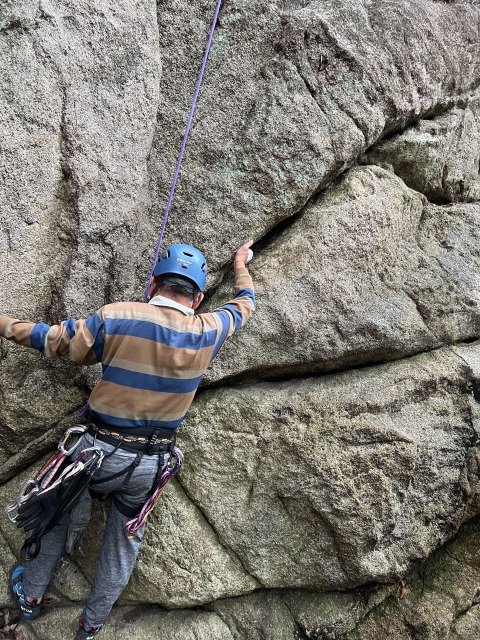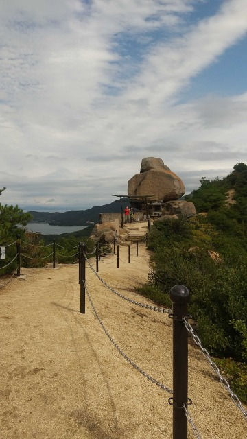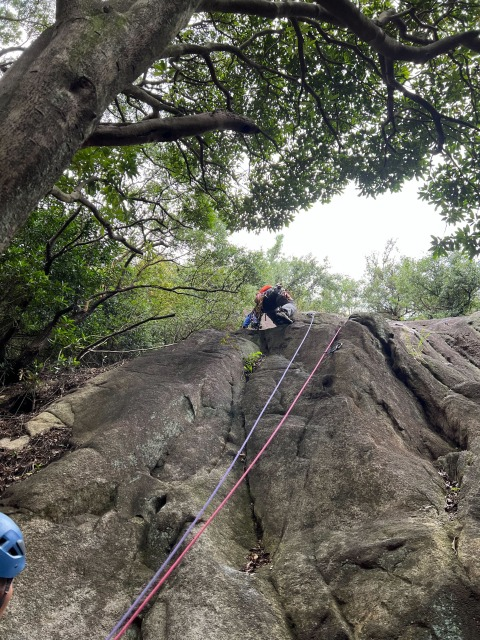 10月9日、10日に小豆島へ会員6名で行った。うち新人一人。初日は吉田の岩場で二組に分かれて岩登り。正午を待たずに雨が降り出す。一組は3ピッチ登る。一組は取り付きの岩場でトップロープなどして遊ぶ。内海へ買い出しに行き、水炊きを炊事場の屋根の下でつつく。夜中、風雨が強まり、30年以上使ったファミリーテントつぶれる。/翌10日は、紅雲亭から表十二景から星ケ城山に登る。途中、瀬戸内芸術祭の作品「空の玉」を見る。道中はガスがでて幻想的だった。下りは裏八景。滑りやすい石段をそれぞれこけながら下る。/船の時間まで間があったので、土庄町小瀬の重岩に行く。対向車がきたらアウトの細道をいき、そのあと300段を越える階段、さらに高所恐怖症には怖い花崗土の稜線を歩いた先に重岩があった。晴れてきて、瀬戸内海の絶景が得られた。