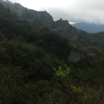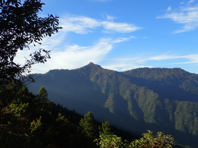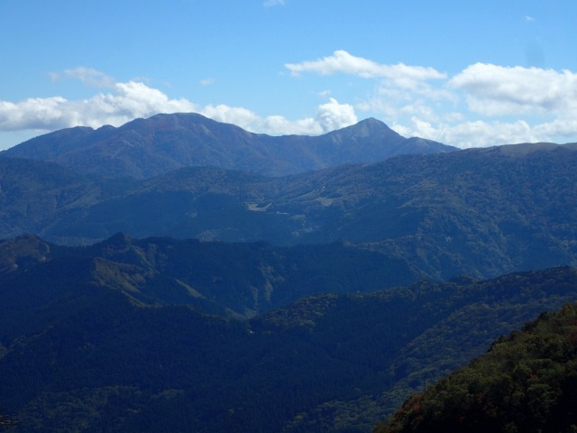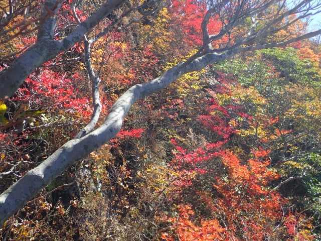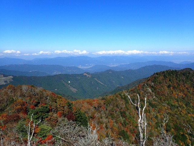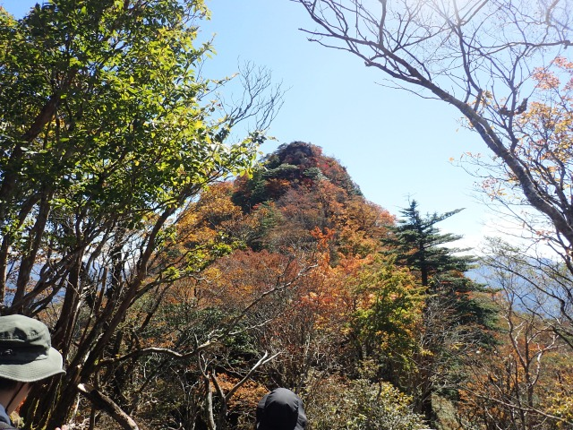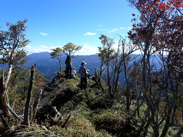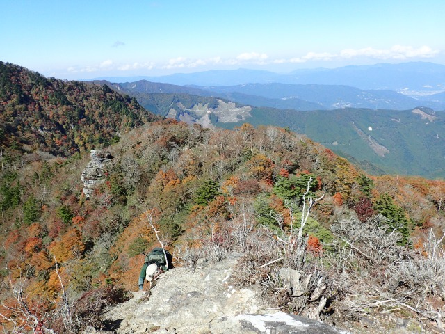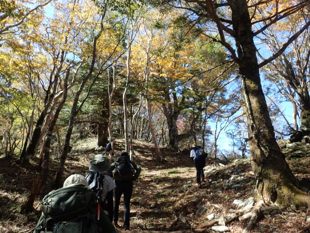 黄葉、紅葉の黒笠山 山行報告 2022.10.1810月16日徳島県の黒笠山に登りました。会員6名。白井から黒笠山を登り小島峠に下った。人工林を過ぎると、トチやナラやカエデやブナの黄葉樹林となる。黄葉と紅葉が逆光に映える。急登と鎖場あり。剣山系を始めとした絶景が秋の青空に広がる。頂上を過ぎたところで、逆方向から登ってきた会員二人と交差する。小島峠まで痩せ尾根をアップダウンを繰り返し下る。ところどころで道をはずす。暗くなったり、荒天のときは迷ってしまうだろう。よく歩いた。黒笠山頂上剣山山系吉野川と讃岐山脈黒笠山