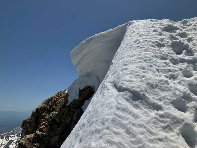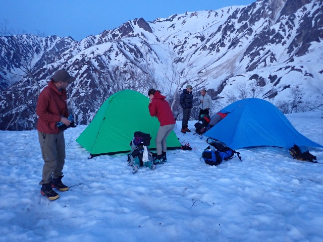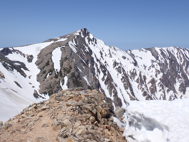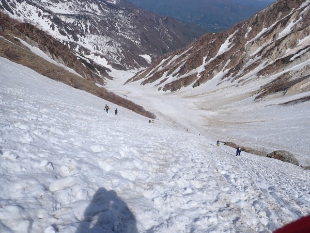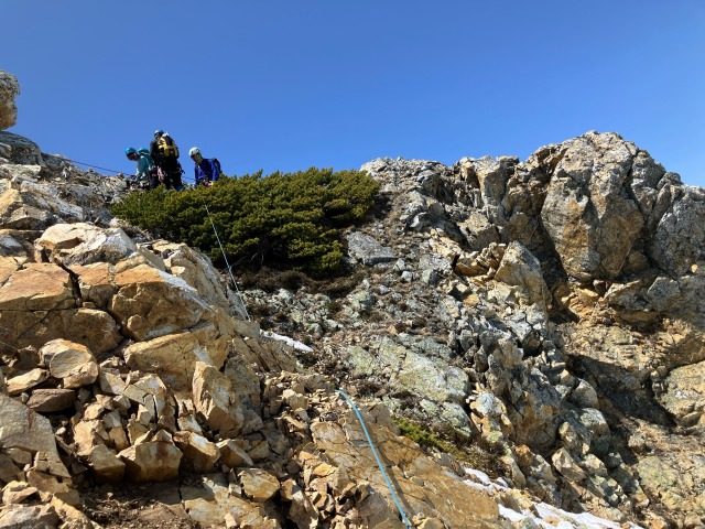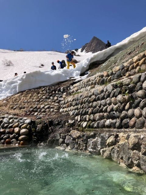 ゴールデンウィーク白馬岳 山行報告 2024.05.14白馬岳に行き、杓子岳双子尾根を登る。今年は、雪解けが早く、ヤブと岩が多く出ていた。もろい岩稜の通過に時間がとられる。大雪渓を降りる。予定の主稜は中止し、鑓温泉に行く。