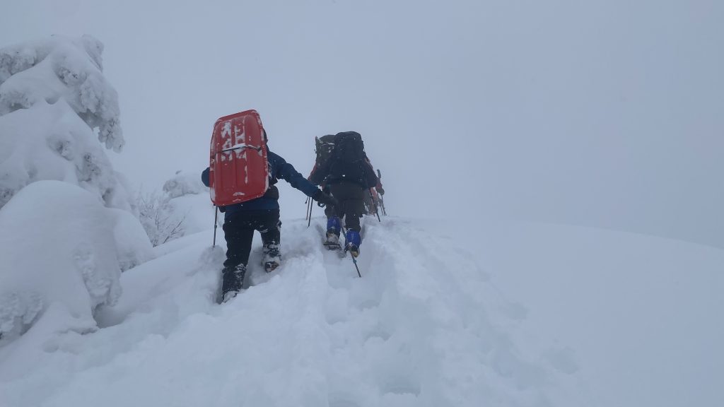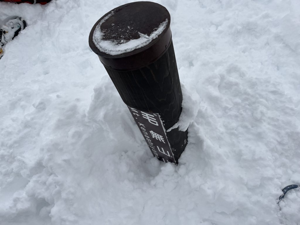 予定より3時間遅れで登頂。まさか毛無山で膝を使ったラッセルをするとは…