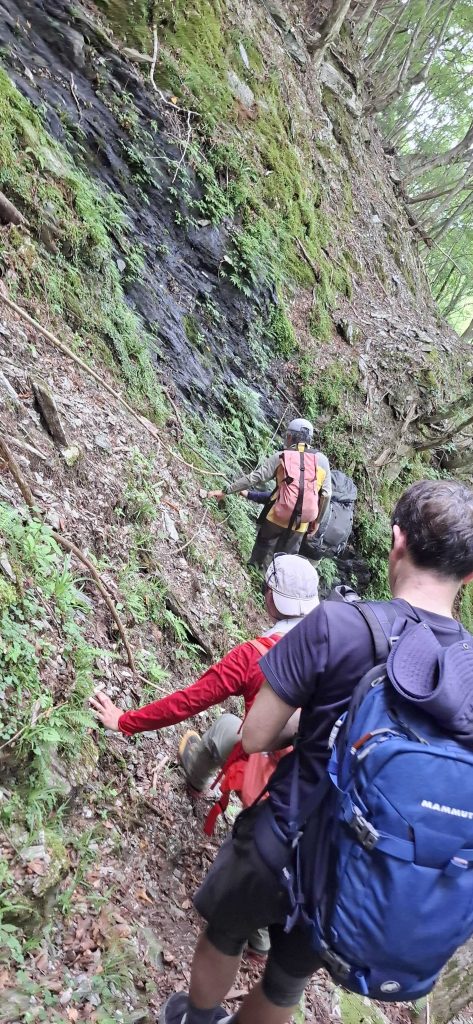 落合峠までは稜線伝いにアップダウンを繰り返しながら下降。落合峠から登山口までは沢沿いを行く。踏み跡はあるがあまり歩かれていない旧道。登山道手前で橋が二ヶ所崩落しており、通過に手間取った。