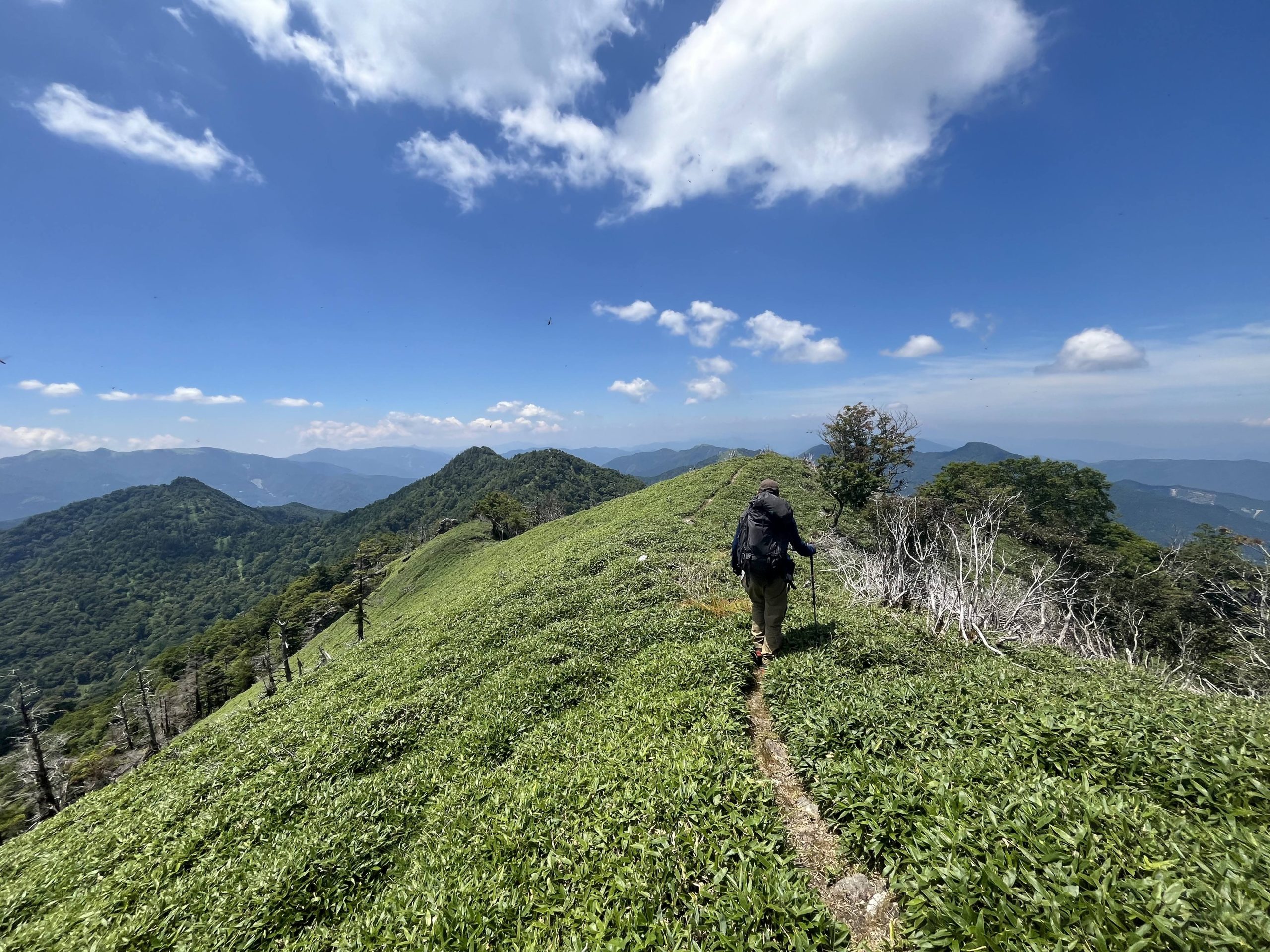 落合峠までは稜線伝いにアップダウンを繰り返しながら下降。落合峠から登山口までは沢沿いを行く。踏み跡はあるがあまり歩かれていない旧道。登山道手前で橋が二ヶ所崩落しており、通過に手間取った。