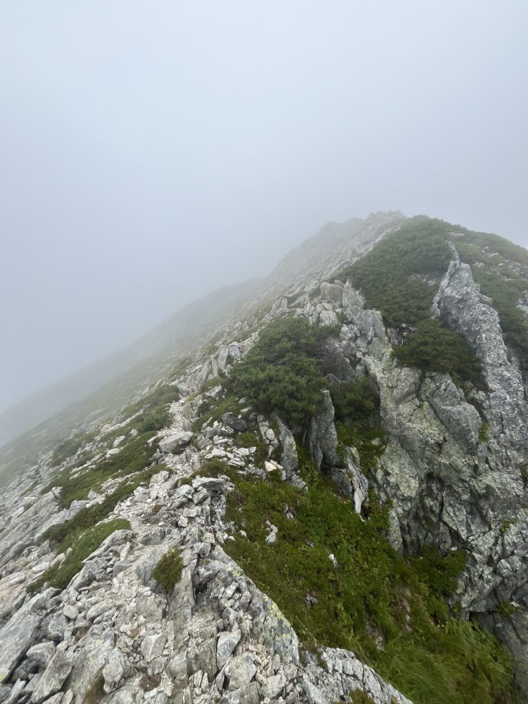 懸垂下降を終え、いよいよ本峰へと登る。脆い岩場なのか、ガレ場となり、ルートも少しわかりづらくなる。落石しないよう、かなり気を使った。ここまで来れば、比較的進みやすくなるため、距離や高度的にはそこそこあるが、時間としては短く感じた。心配したYさんの体調もなんとか持ち、全員で頂上に到着!到着と共に背後の霧の中から源次郎尾根が姿を現す。頂上ですこしゆっくりしていると、青空が見えるときもあった。頂上へと突き上げる源次郎尾根は素晴らしい達成感を得られるいいルートだと感じた。