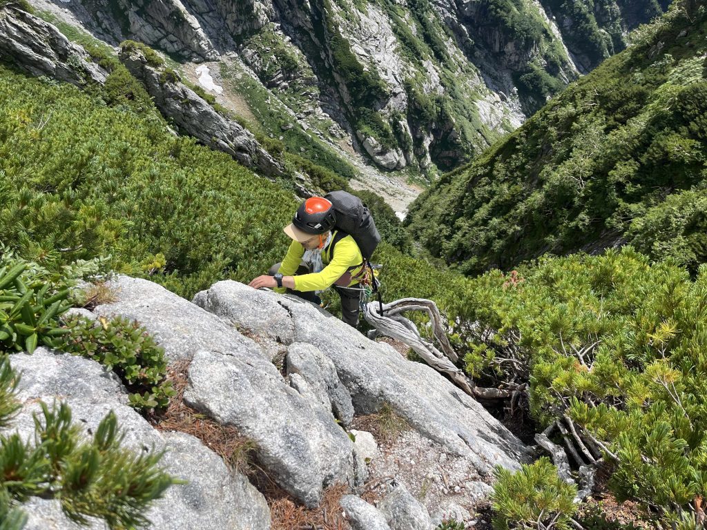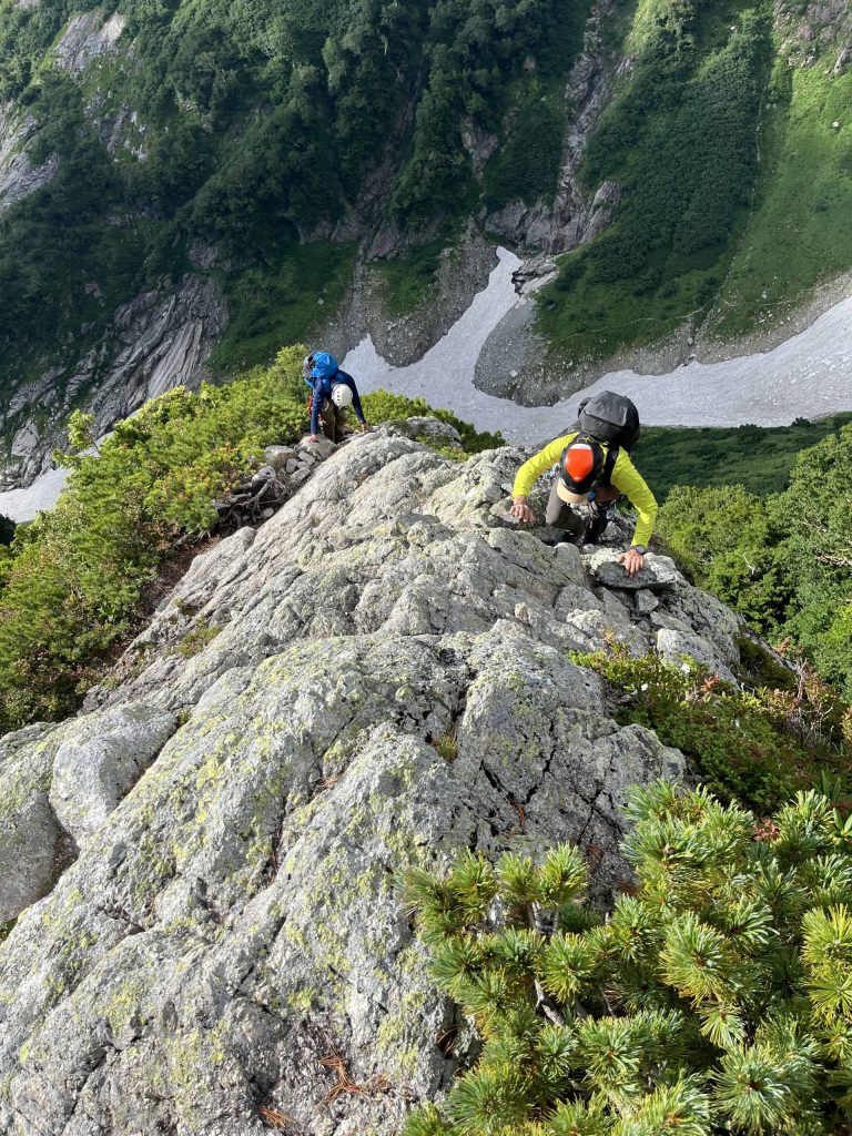 ガレ場も多いので、後続に落石をしないために、慎重に進んでいく。凹角の岩(チムニー)を抜け、 Ⅰ峰が近づくと、高度感が出てくるとともに樹林も減り、風が良く抜けて気持ちが良い。それにしてもアルプスも暑い。ホールドはしっかりしているものの、落ちたら即死の部分はスリングでサポートする。