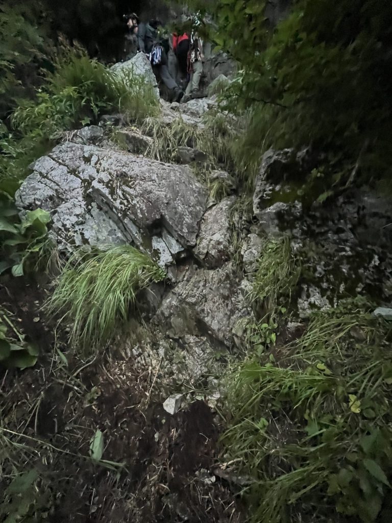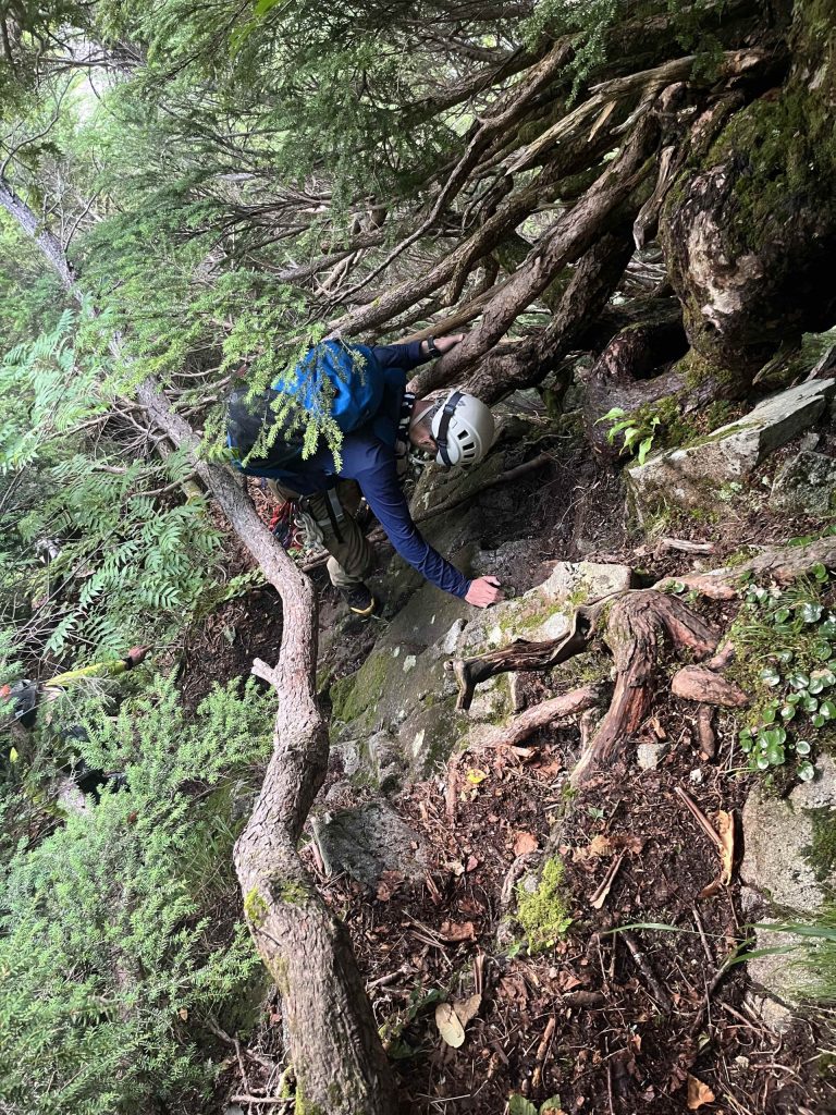 そこを突破すると、猛烈な藪が始まる。かなりハイマツ(?)をつかみながら登ってしまったが、もう少し岩を使えば登れたのではないか?と反省。クライミングのスキルが高いSさんは、岩を使って上手く登っていた模様。私はというと、枝を掴み回り腕がかなり疲労。これではいけないと一旦冷静になる。Yさんの息が異常に上がっているのが気にかかる…