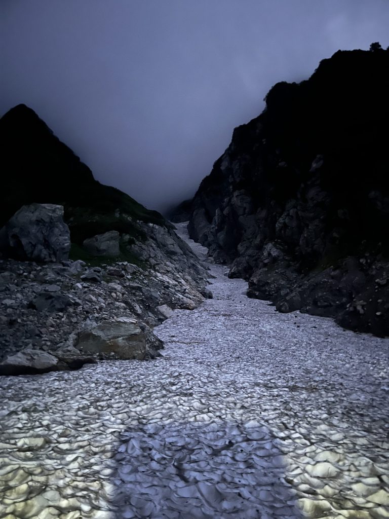 昨日の道の先からは、雪渓に入るため、アイゼンを装着。夏の雪渓はカチカチの雪だ。夜明けはまだ先である。ちょうど取付き付近に着いた所で、夜明けを迎える。取付への道は思ったより傾斜が強い。ガレ場を登ると、皆さんの写真の通り、明瞭な踏み跡がある。
