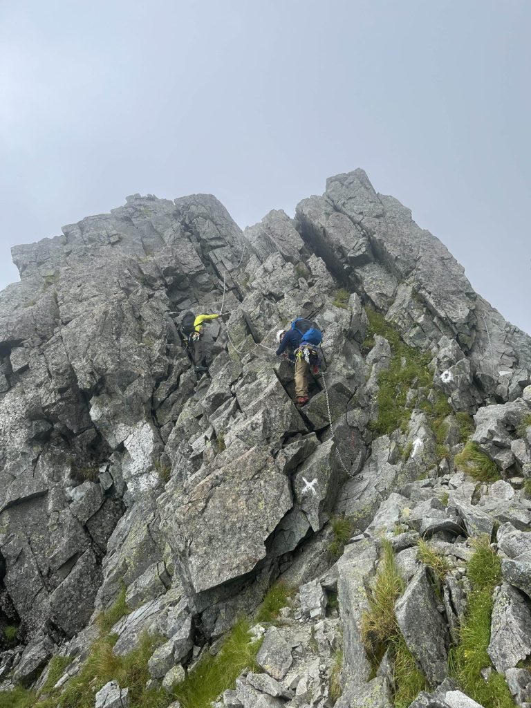 取付からハイマツの藪を抜け、白い岩場と凹角の岩を越えてⅠ峰に着く。Ⅱ峰の登りはガバだらけの快適なクライミング。懸垂待ちも30分くらいでスムーズ。本峰の登りはガラガラで足場に気を使った。