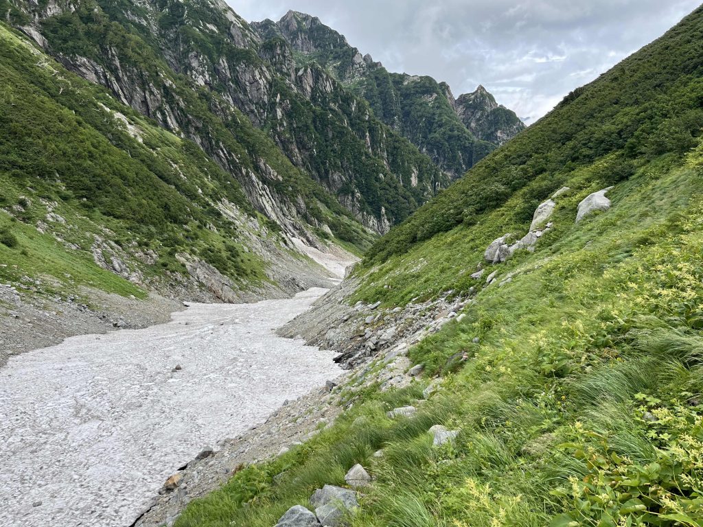 剱沢キャンプ場にテントを設営後、明日の取付までの道を確認しに行く(取付まで行くと往復3時間とかなり時間がかかるので、1時間程度進む)。途中までは、雪渓に下りることなく、斜面のトラバースで行けそう。