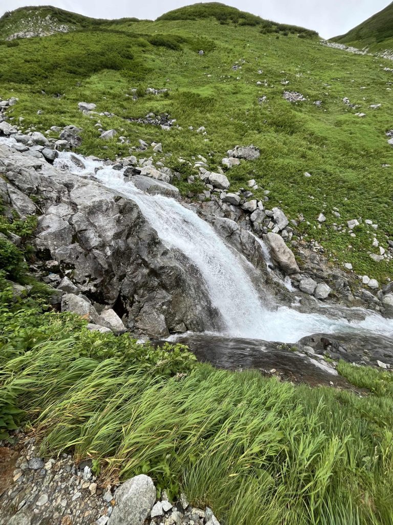 室堂は曇り。登りだしは雨が降ったり止んだりの天候。登攀道具が入った重たいザックは20kg~22kgゆっくりと高度を上げていく。