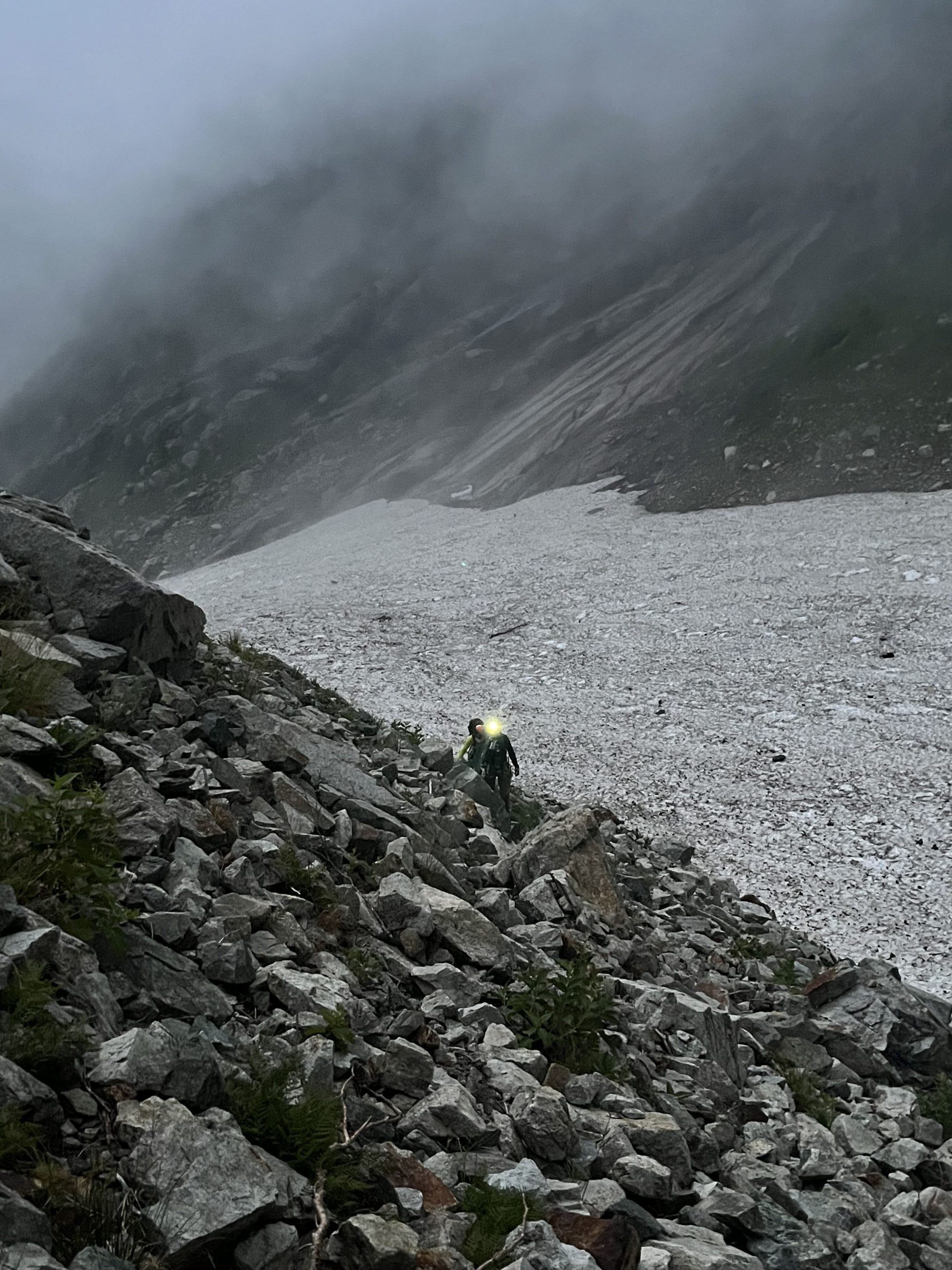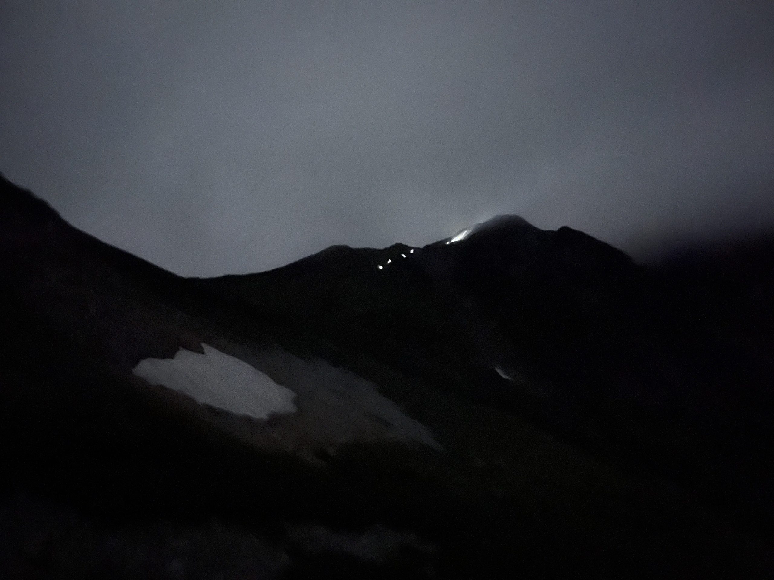 出発は3:30。まだ暗い中、出発。別山尾根にはヘッドランプの明かりが複数灯る。