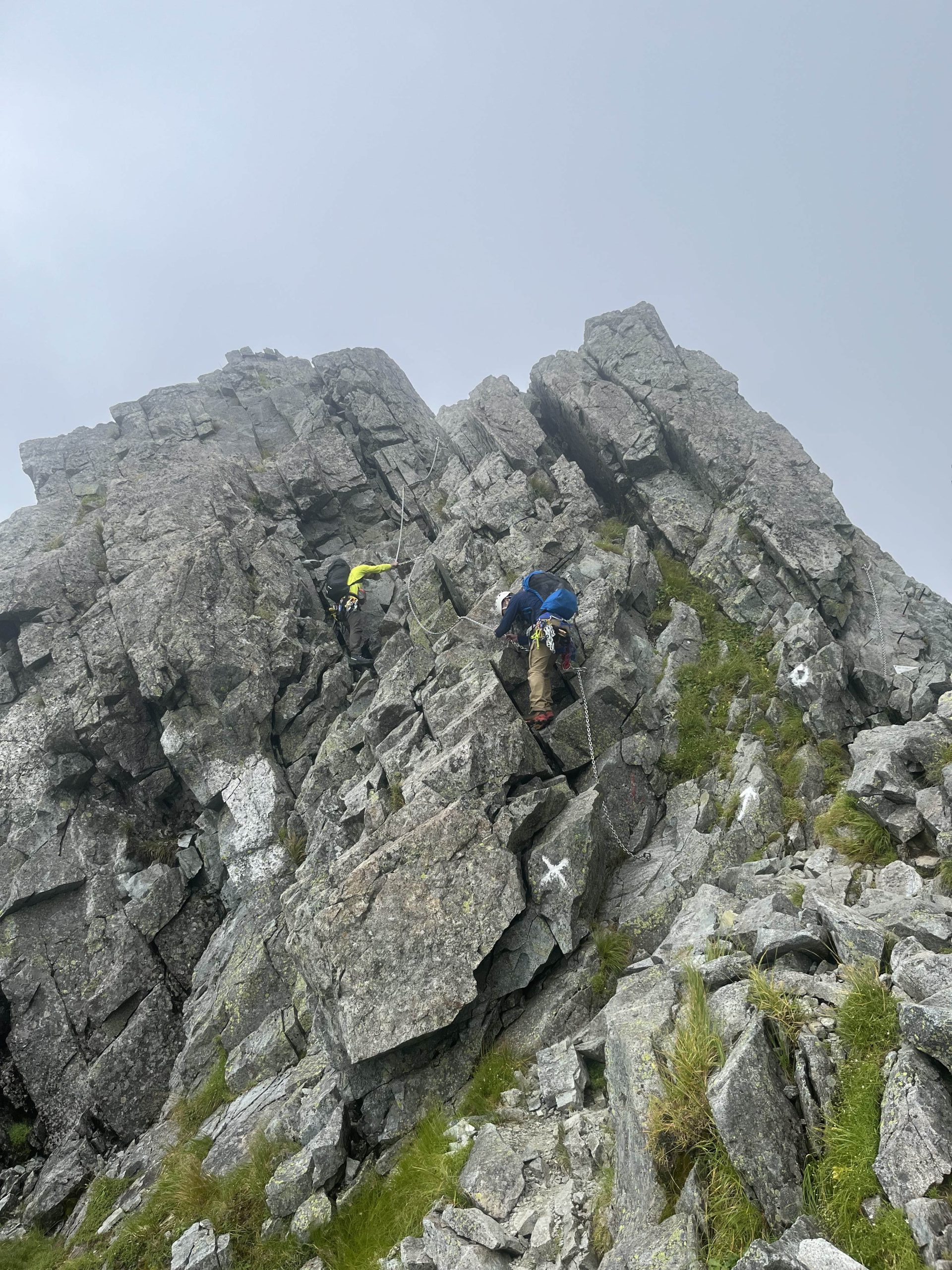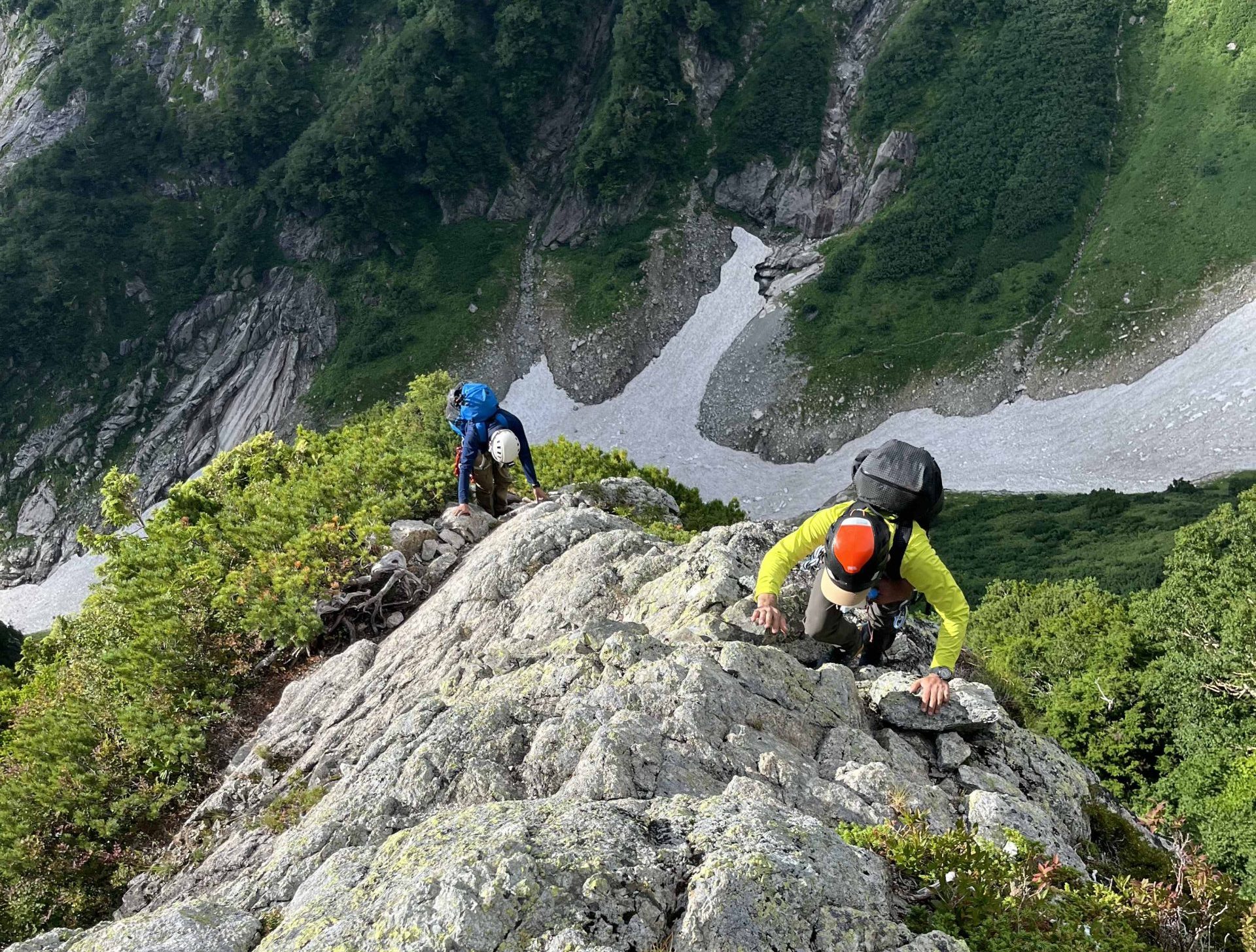 ガレ場も多いので、後続に落石をしないために、慎重に進んでいく。凹角の岩(チムニー)を抜け、 Ⅰ峰が近づくと、高度感が出てくるとともに樹林も減り、風が良く抜けて気持ちが良い。それにしてもアルプスも暑い。ホールドはしっかりしているものの、落ちたら即死の部分はスリングでサポートする。
